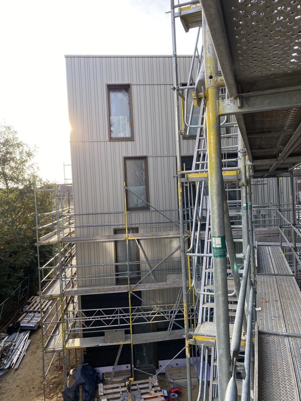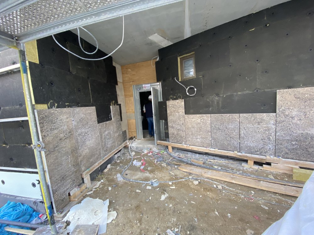 zum Innenausbau werden Fassadenarbeiten ausgeführt.